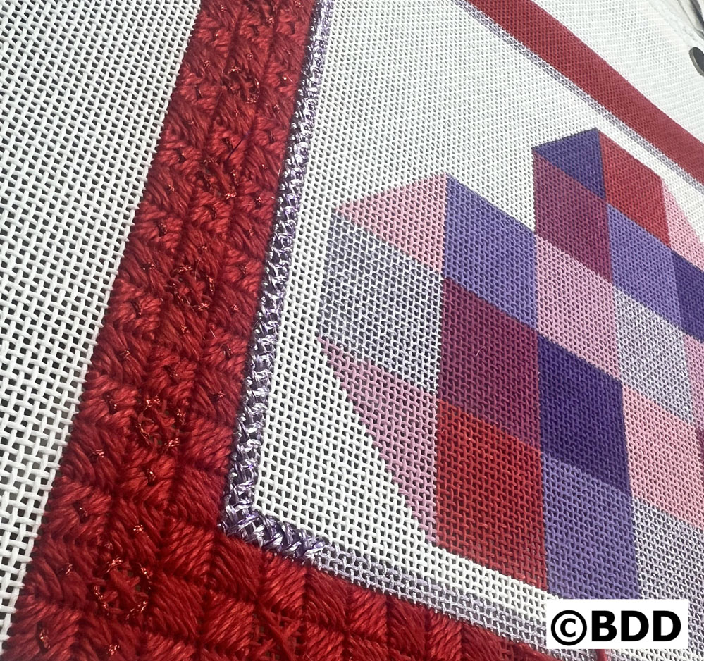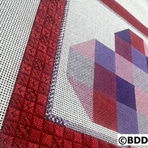 This fits a scalloped acrylic tray made by Glikceil 9″ x 9″ with bottom insert of 8″ square!! Pre-orders included this tray. Due to limitations of vendor for larger quantities, it is easier for stitchers to order the tray directly on Amazon. Instructions in stitchguide will be specific for finishing and inserting into this scalloped tray.