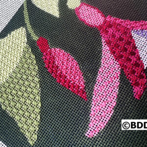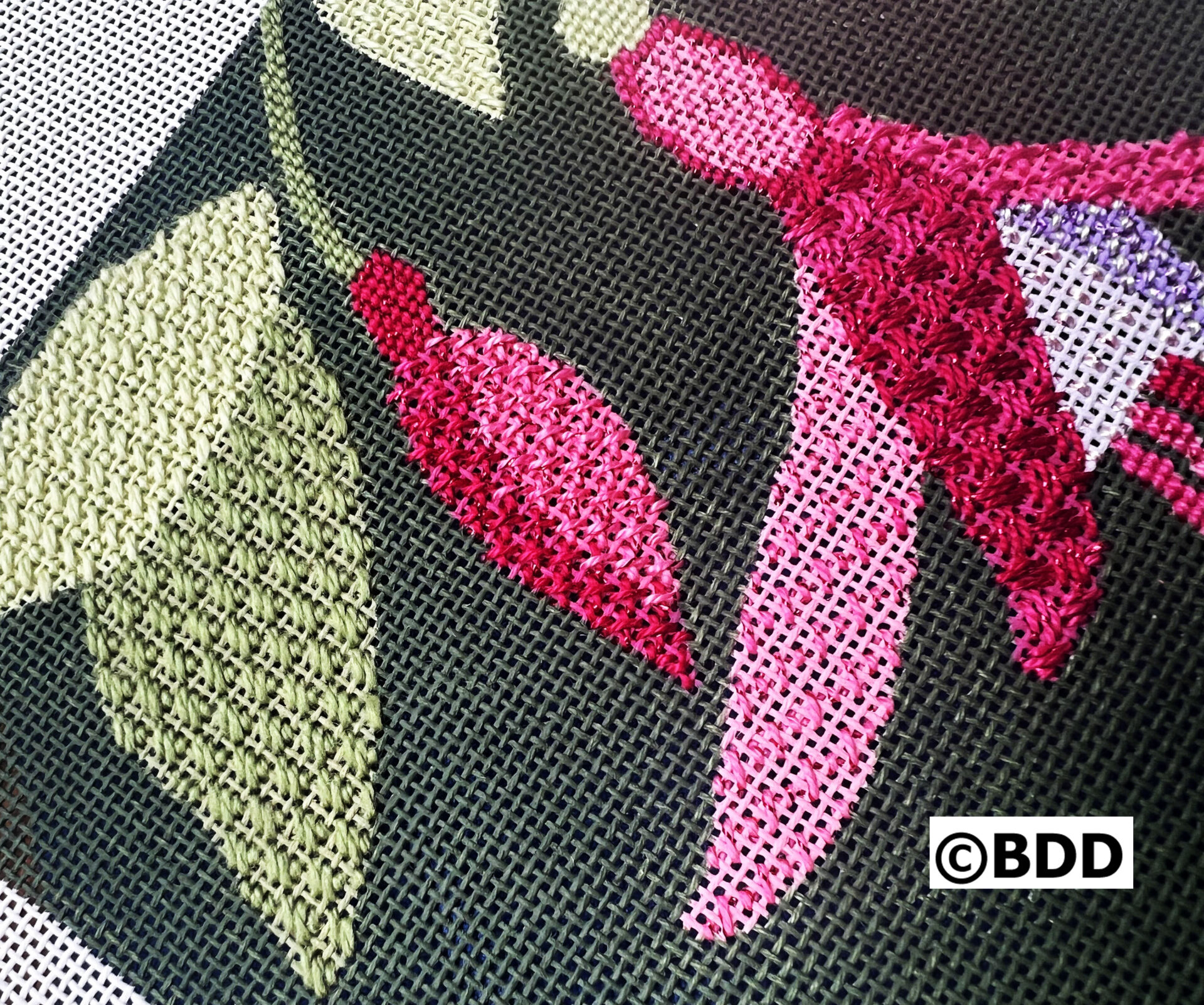 “Woodland Fuschia” is handpainted on 18 count Zweigart.